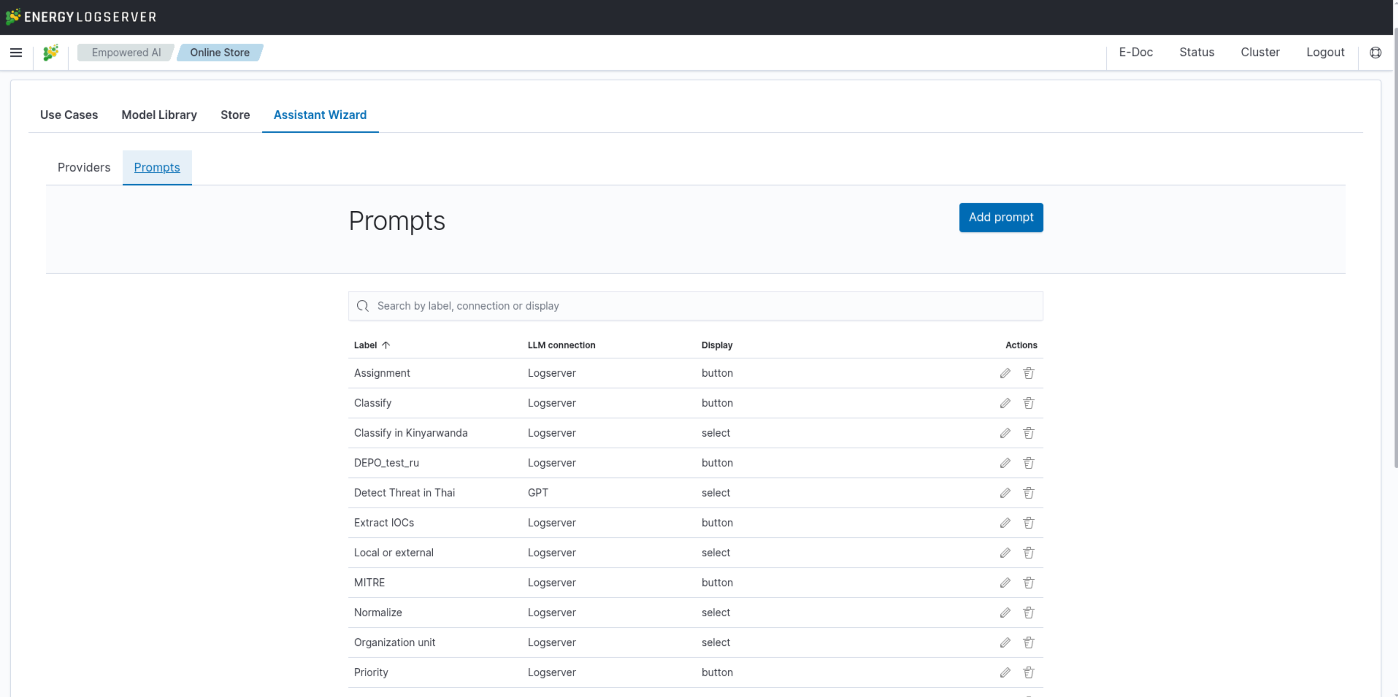 Energy Logserver allows you to create custom prompts for use in the AI Assistant. A prompt describes a problem to solve using a provided log entry — it can be any analytical task or technical inquiry that the model can address. Each prompt can be assigned its own AI provider.