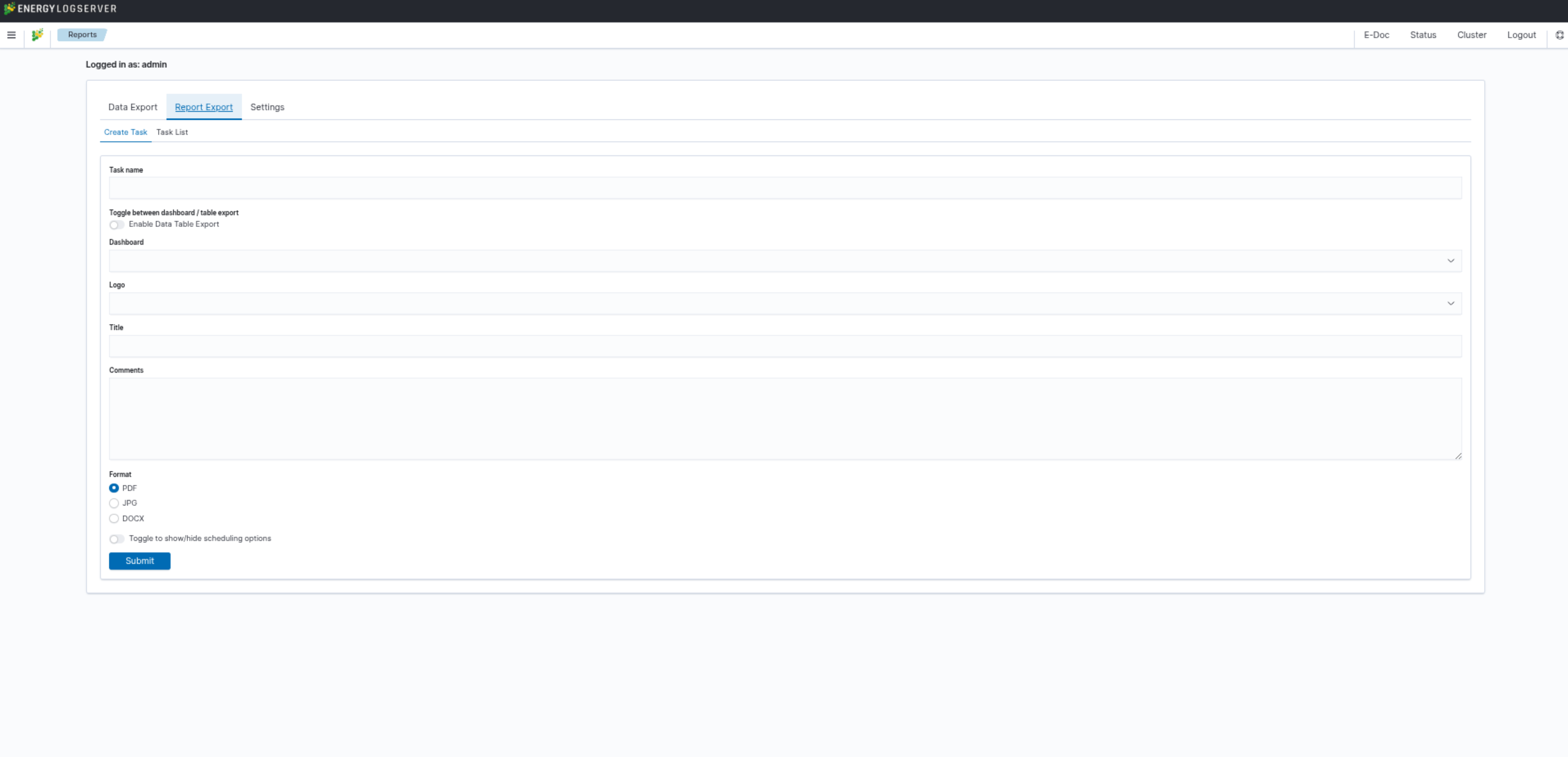 The Report Export tab allows you to generate graphical reports from dashboards in PDF, JPG, or DOCX format.