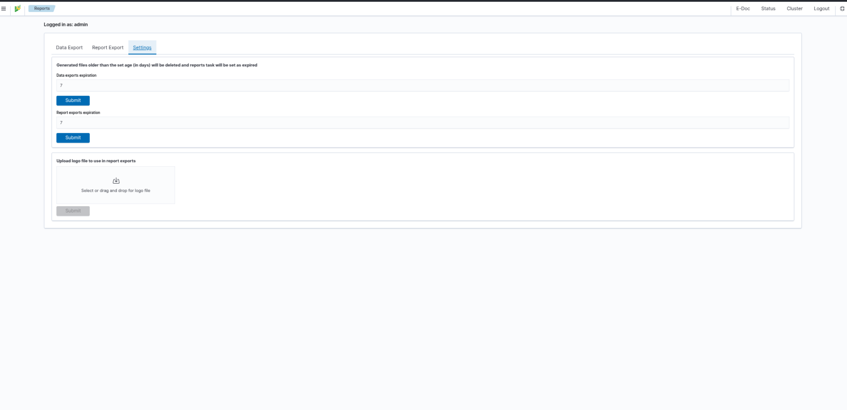 The Settings tab allows you to configure retention periods for generated files and upload a logo for use in report exports.