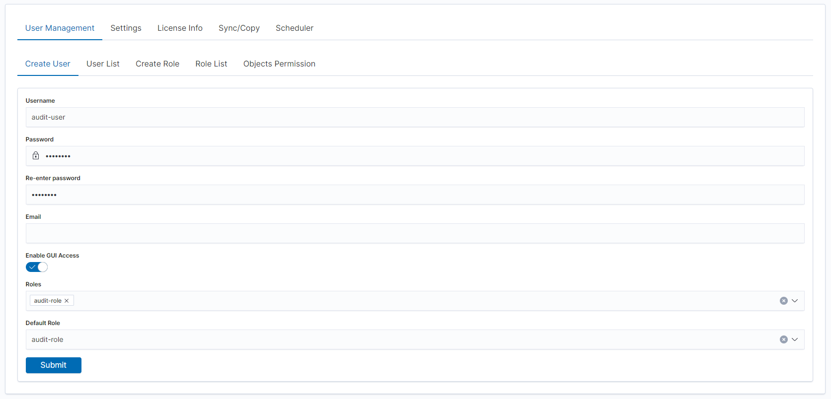 Admin can modify password, email, GUI Access, Roles, Default Role